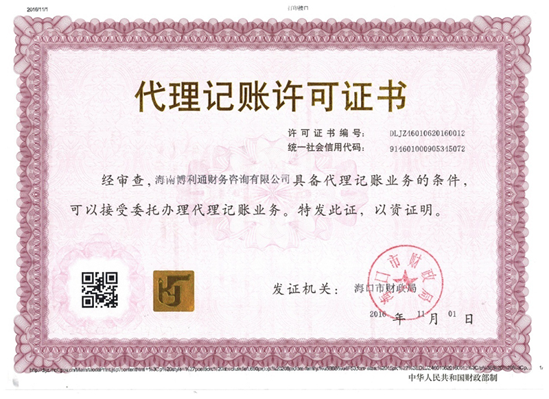 海南博利通財(cái)務(wù)咨詢有限公司是經(jīng)海南省市場(chǎng)監(jiān)督管理局、海口市財(cái)政局批準(zhǔn)設(shè)立的專業(yè)代理工商、稅務(wù)的服務(wù)公司。公司成立于2014年,持續(xù)為數(shù)以千計(jì)的中小企業(yè)提供了各項(xiàng)工商、財(cái)稅的專業(yè)服務(wù),為廣大中小企業(yè)客戶提供了專業(yè)、高效、規(guī)范的公司事務(wù)服務(wù),公司是經(jīng)財(cái)政局審核批準(zhǔn)擁有代理記賬許可證的專業(yè)正規(guī)代理公司