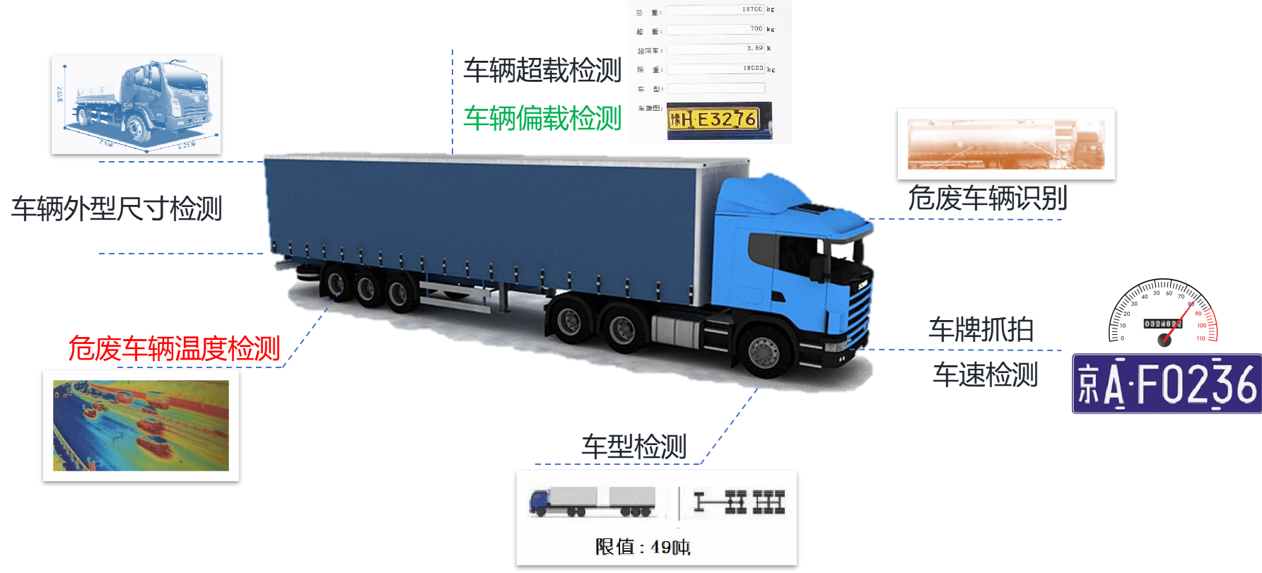 • 融合電子信息、計(jì)算機(jī)、圖像等技術(shù),對(duì)超載車輛、違法行為進(jìn)行監(jiān)管及處置